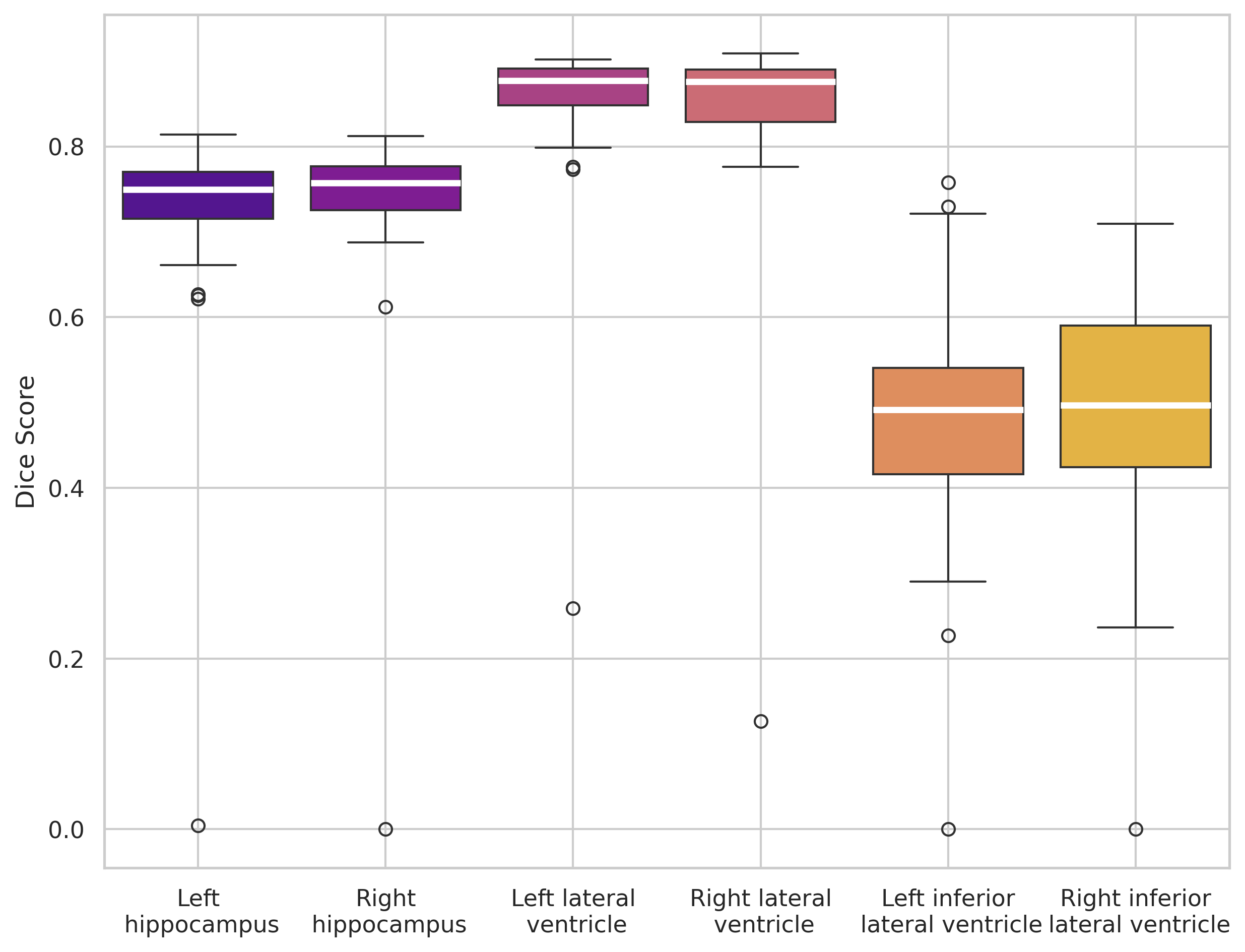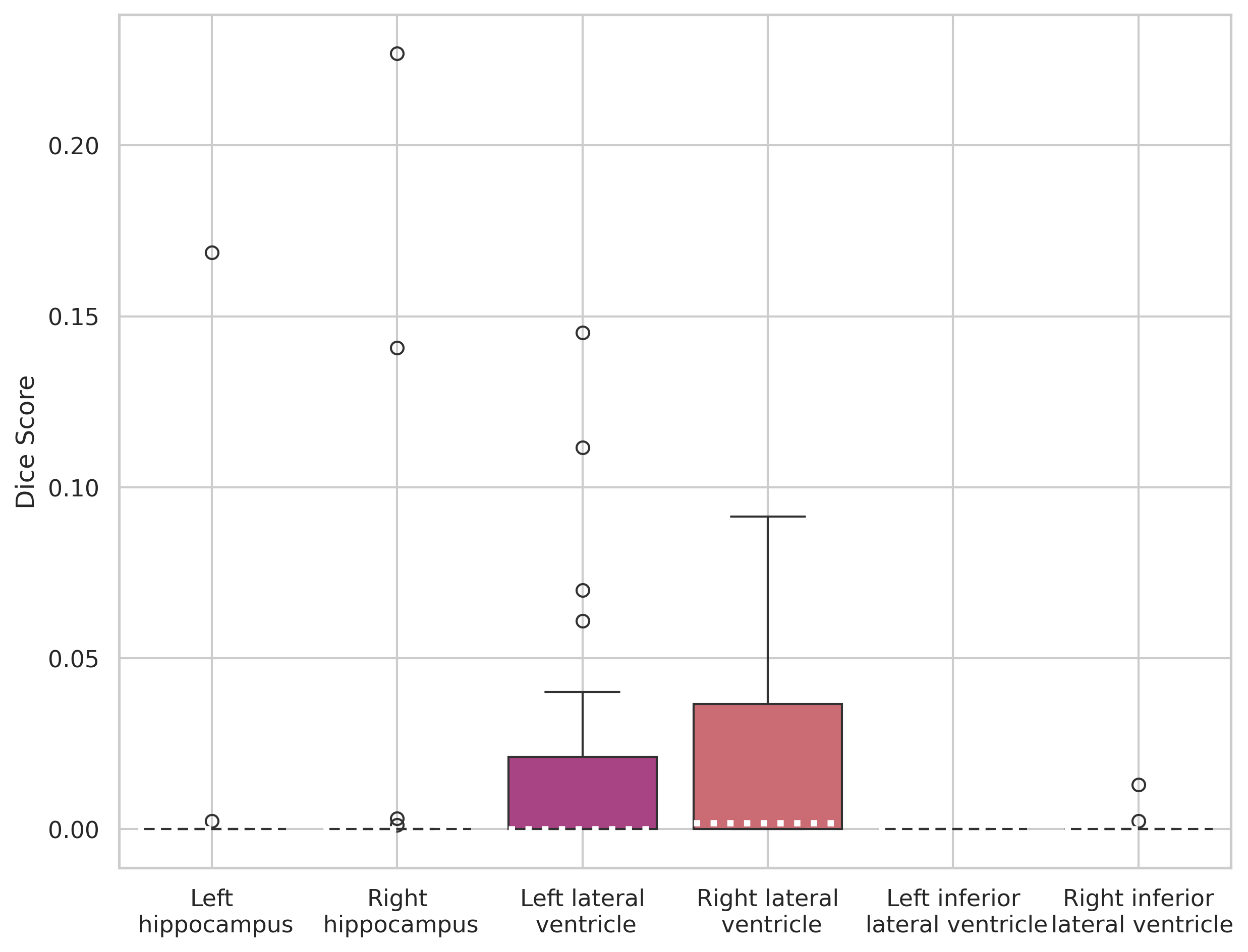 nnUNet cross-dataset inference reveals a strong bias toward symmetric structure placement: shapes are captured correctly, but left/right class assignment fails. Dice scores increase dramatically when labels are merged by structure or foreground, indicating preserved shape understanding but poor semantic consistency across domains.