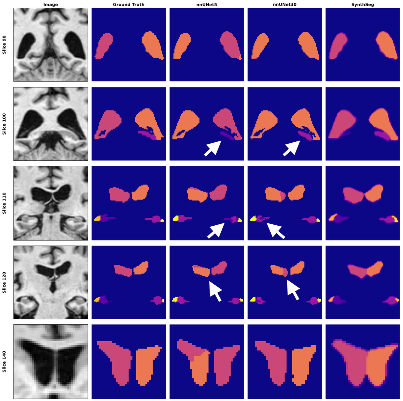 Experiments were performed using nnUNet and SynthSeg. SynthSeg is treated as an out-of-the-box benchmark requiring no training, while nnUNet serves as a data-driven baseline trained with very limited annotations (5 or 30 image–mask pairs).